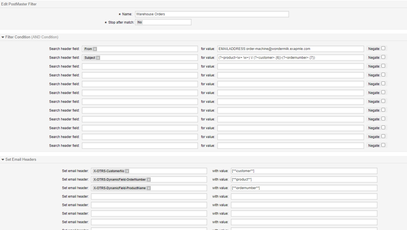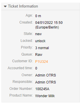 Our ordering software generated this email subject and sent the mail to warehouse@wondermilk.exapmle.com. The warehouse team must record the product ordered, assign a customer to the ticket, and copy the invoice number to the proper dynamic field on the ticket. This all takes time, and the orders are mounting.