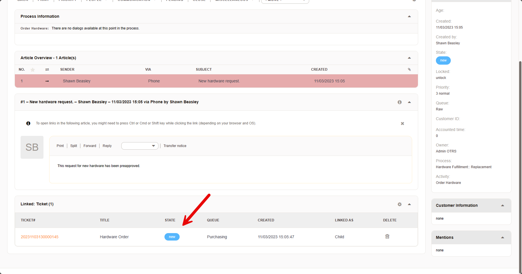 Immediately, a notification is sent to the customer that an order was created, including the order number and a link to the order in the customer portal. The IT Department, which has to wait for the order to schedule a replacement appointment, clearly sees in the ticket the order status in the process information, and the state of the ticket in the link ticket area. The agent can always add a note to the linked ticket to request feedback.