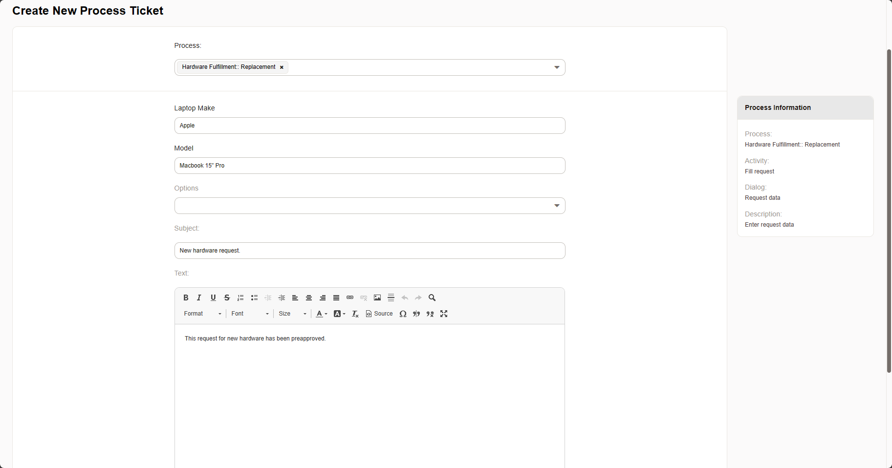 A user requests a new laptop by starting the hardware replacement process. A selection is made based on available options in the customer interface. Make, model, and some options are available. This request is forwarded to the IT department, and the service Hardware Fulfillment is automatically assigned to the ticket (as well as other important ticket data). Upon review, the agent sees that no operational modules are on reserve and chooses "Order Hardware" from the process. Because the back office does purchasing, an interface to the purchasing department is needed.