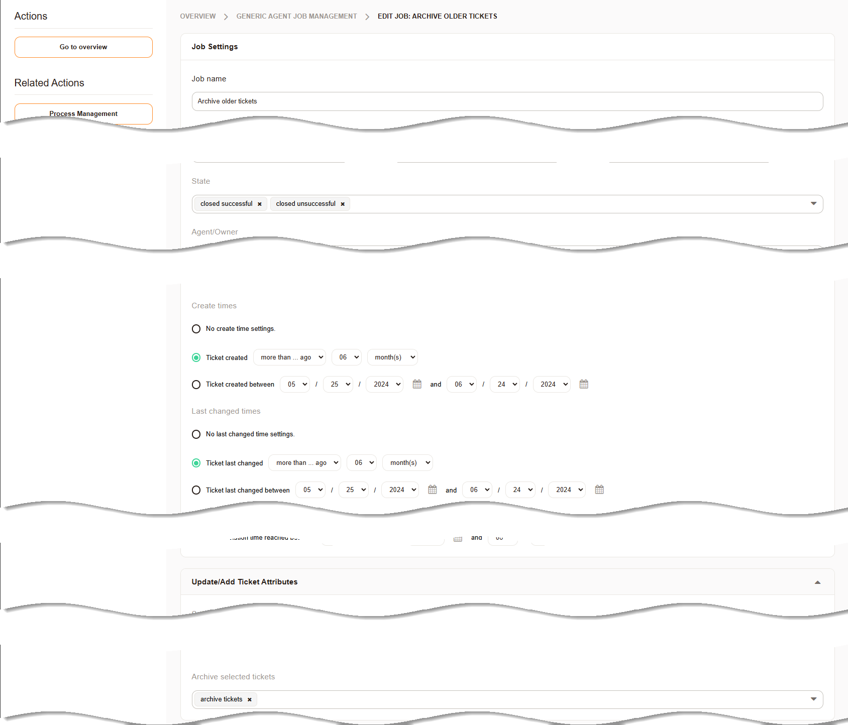 A good practice is to archive all tickets that are more than six months old, have not been modified within the last six months, and are closed. This will ensure that even a ticket that meets the age criteria will not be archived if there is still activity on the ticket.