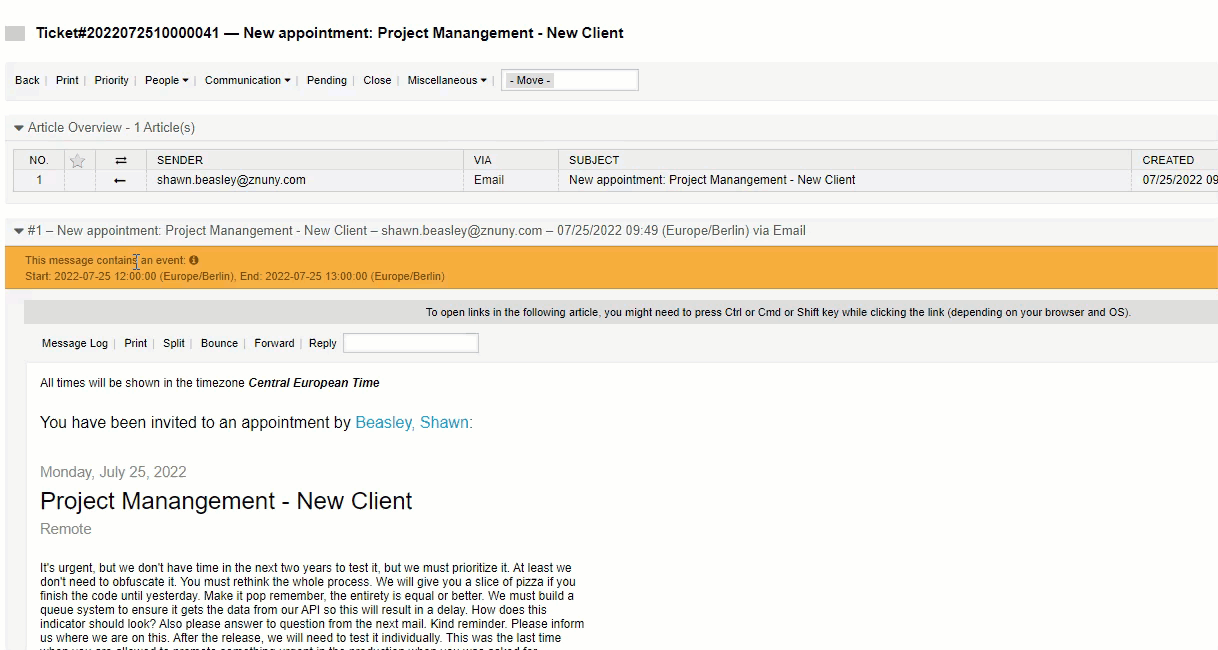 Znuny makes use of our loader and layering technology to show a notification on all articles which include a calendar appointment.